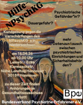 Der BPE macht am Do. 16.4. um 10 Uhr in Hannover ganz in der Nähe des Landtags eine Demonstration während der Anhörung in dessen Gesundheitsausschuss: „Dauergefahr durch psychisch Kranke“- Weg mit dem PsychKG